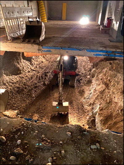At Riemergasse 7, things are bustling – quite literally: we are currently excavating the garage. We are using a truck-mounted excavator to lift the material from Basement Level 3 up to street level.