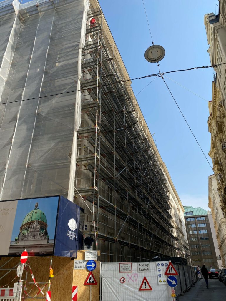 Our second scaffold on Jakobergasse is currently being assembled; it is 70 meters long and about 25 meters high. The third and final scaffold on Zedlitzgasse will be assembled next week over our construction containers.